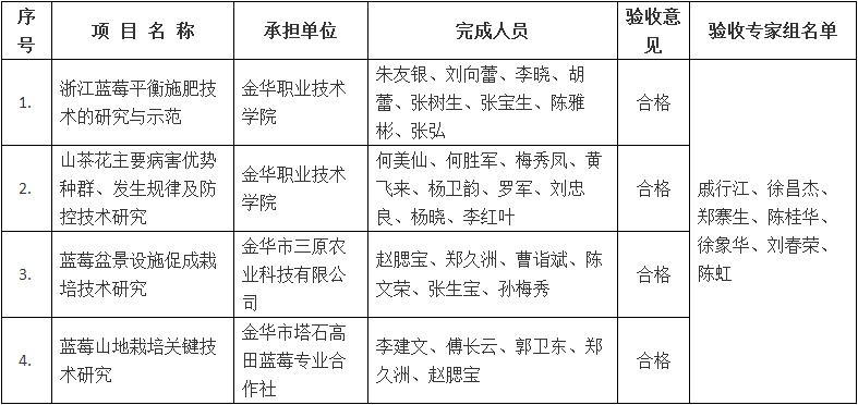 根據(jù)《金華市級科技計劃項目驗收管理辦法》(金市科字〔2015〕83號)規(guī)定,現(xiàn)將金華職業(yè)技術(shù)學(xué)院承擔(dān)的《浙江藍莓平衡施肥技術(shù)的研究與示范》等市級科技計劃項目驗收結(jié)果予以公示,接受社會監(jiān)督,公示期從2018年7月17日至2018年7月24日止。任何單位和個人對驗收意見持有異議的,應(yīng)當在公示期內(nèi)書面向市科技局提出異議,單位應(yīng)采用書面形式并加蓋公章,個人應(yīng)采用實名提出異議。