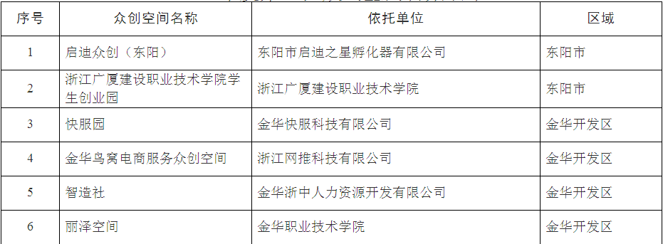 根據(jù)《金華市眾創(chuàng)空間管理辦法(試行)》(金市科〔2016〕70號(hào))規(guī)定,經(jīng)研究,同意啟迪眾創(chuàng)(東陽(yáng))等6家單位備案為金華市眾創(chuàng)空間。
