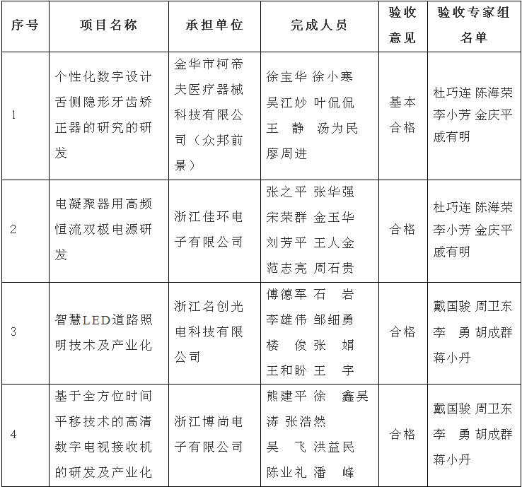 根據(jù)《金華市級科技計劃項目驗收管理辦法》(金市科字〔2015〕83號)規(guī)定,現(xiàn)將金華市柯帝夫醫(yī)療器械科技有限公司(眾邦前景)、浙江佳環(huán)電子有限公司、浙江名創(chuàng)光電科技有限公司、浙江博尚電子有限公司承擔(dān)的《個性化數(shù)字設(shè)計舌側(cè)隱形牙齒矯正器的研究的研發(fā)》、《電凝聚器用高頻恒流雙極電源研發(fā)》、《智慧LED道路照明技術(shù)及產(chǎn)業(yè)化》和《基于全方位時間平移技術(shù)的高清數(shù)字電視接收機(jī)的研發(fā)及產(chǎn)業(yè)化》4個市級科技計劃項目驗收結(jié)果予以公示,接受社會監(jiān)督,公示期從2018年1月10日至1月17日止。
