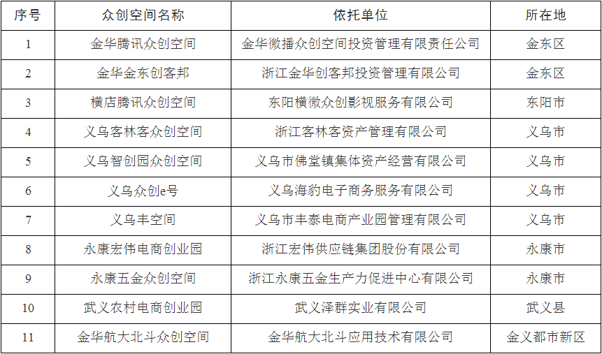 根據(jù)《金華市眾創(chuàng)空間管理辦法(試行)》(金市科〔2016〕70號)規(guī)定,經研究,同意金華騰訊眾創(chuàng)空間等11家單位備案為金華市眾創(chuàng)空間。