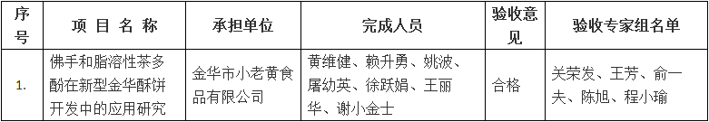 根據(jù)《金華市級(jí)科技計(jì)劃項(xiàng)目驗(yàn)收管理辦法》(金市科字〔2015〕83號(hào))規(guī)定,現(xiàn)將金華市小老黃食品有限公司承擔(dān)的《佛手和脂溶性茶多酚在新型金華酥餅開發(fā)中的應(yīng)用研究》市級(jí)科技計(jì)劃項(xiàng)目驗(yàn)收結(jié)果予以公示,接受社會(huì)監(jiān)督,公示期從2018年8月21日至2018年8月28日止。任何單位和個(gè)人對(duì)驗(yàn)收意見持有異議的,應(yīng)當(dāng)在公示期內(nèi)書面向市科技局提出異議,單位應(yīng)采用書面形式并加蓋公章,個(gè)人應(yīng)采用實(shí)名提出異議。